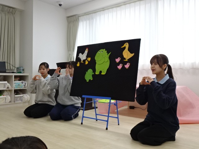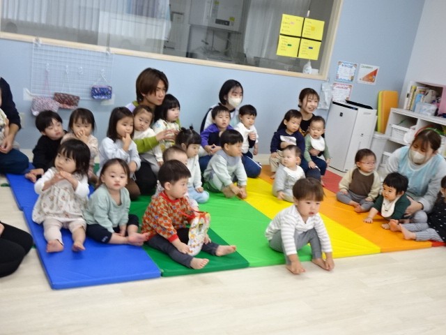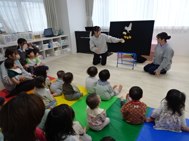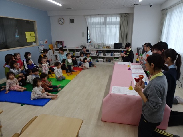 今回は坪内総合ビジネスカレッジのこども総合学科の学生さんが歌や絵本、シアター、ハンドベルなどのお楽しみを披露してくださいました。学生さんの出し物が始まると動きを真似したり、お話や演奏をじっと見たりしながら最後まで釘付けな子どもたちでした。最後には学生さんと笑顔でハイタッチし、楽しい誕生会になりました!