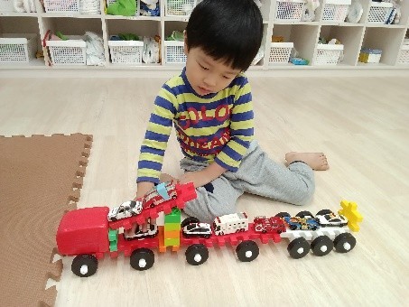 ブロック遊びでは、レゴブロックとニューブロックを組み合わせ、ブロックをゴミに見立ててゴミ収集車を作る姿もあります。