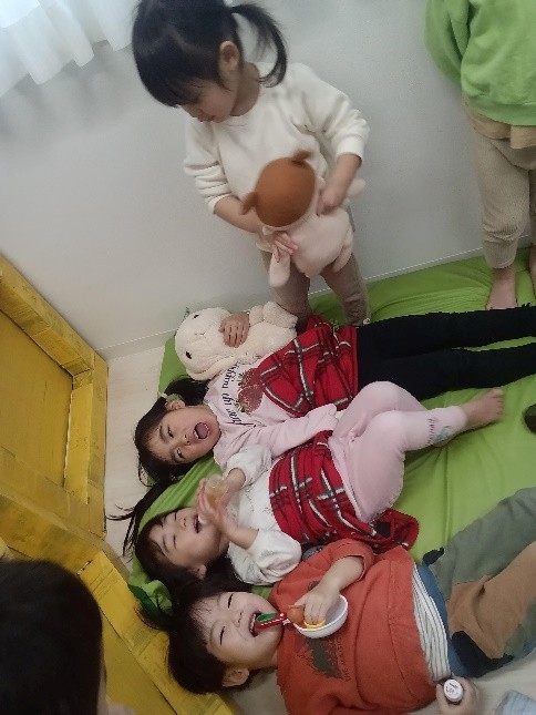 ままごと遊びでは、自分たちで役割を決めて、お母さんや赤ちゃんになりきっています。