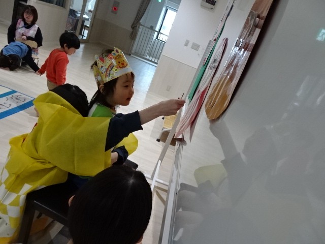 「笑う門には福来る」という言葉があるように、笑顔で新しい一年を迎えることの大切さを伝えながら、誕生月の子どもと保育教諭が二人一組で参加しました。「もうちょっと上だよ」「あってるよ!」と誕生児さんは夢中になってヒントを出してくれました。