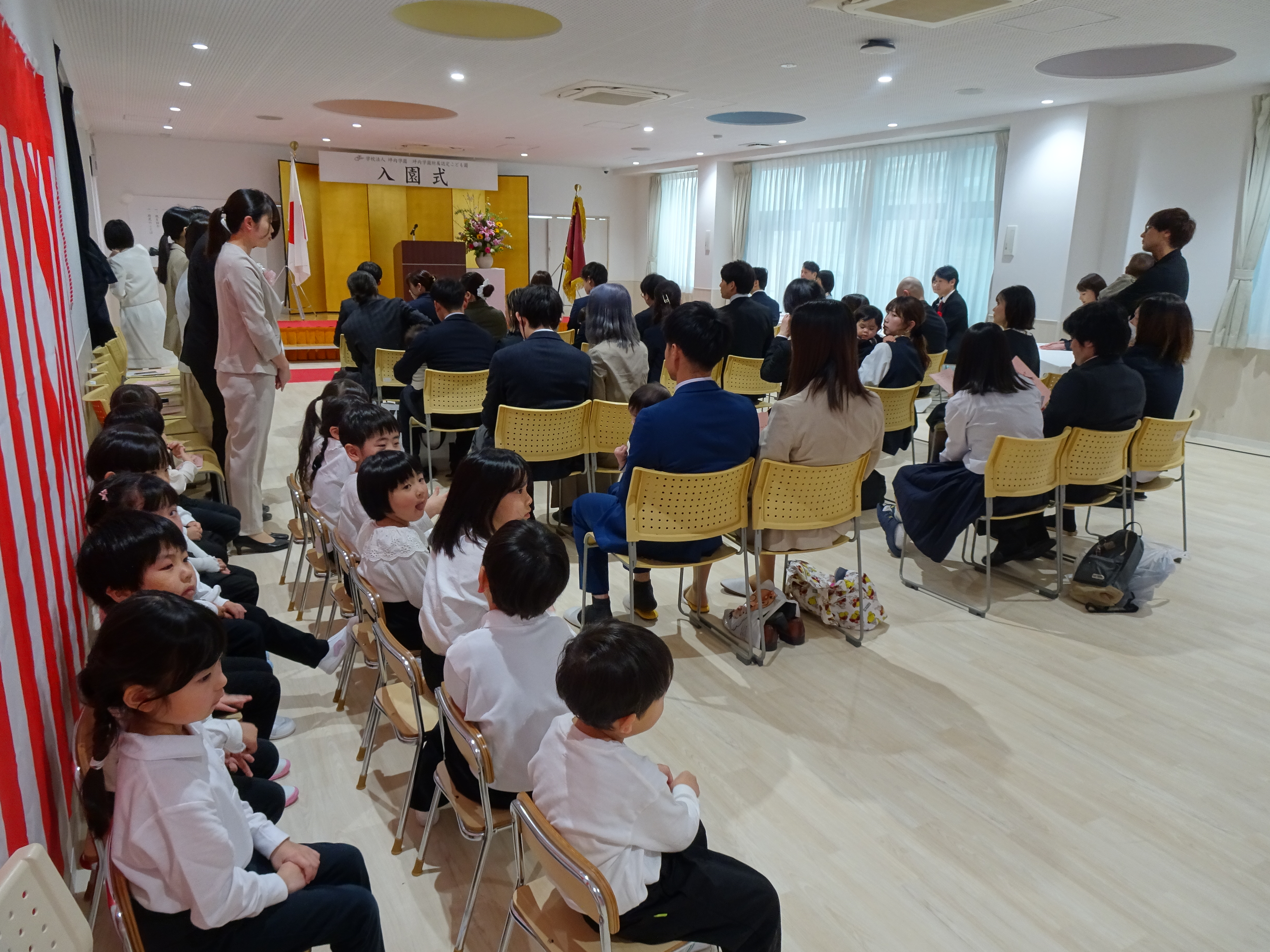 入園式では、新入園児のお名前が呼ばれると、少し緊張しながらも保護者の方と一緒に元気にお返事する姿があり、とても微笑ましいひとときとなりました。また、5歳児の子どもたちが歓迎の言葉と歌を披露してくれました。年長児としての自信が感じられる堂々とした姿は、とても頼もしく、これからの成長がますます楽しみです。