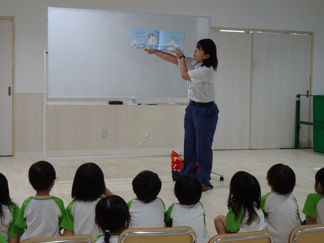 「いかのおすしの合言葉」「プライベートゾーンってなんだろう」の話に耳を傾けて真剣なまなざしで聞く、子どもたちは、元気よく「いかのおすし」の標語クイズに答えていました。警察の方からは、楽しくわかりやすく、子どもたちが自分で自分の身を守る方法5つ「ついていかない」「車にのらない」「おおごえを出す」「すぐにげる」「大人にしらせる」を教えていただきました。また、プライベートゾーンのお話では、絵本を読んでもらい、嫌だと感じたことは嫌だと言っていいことも学びました。